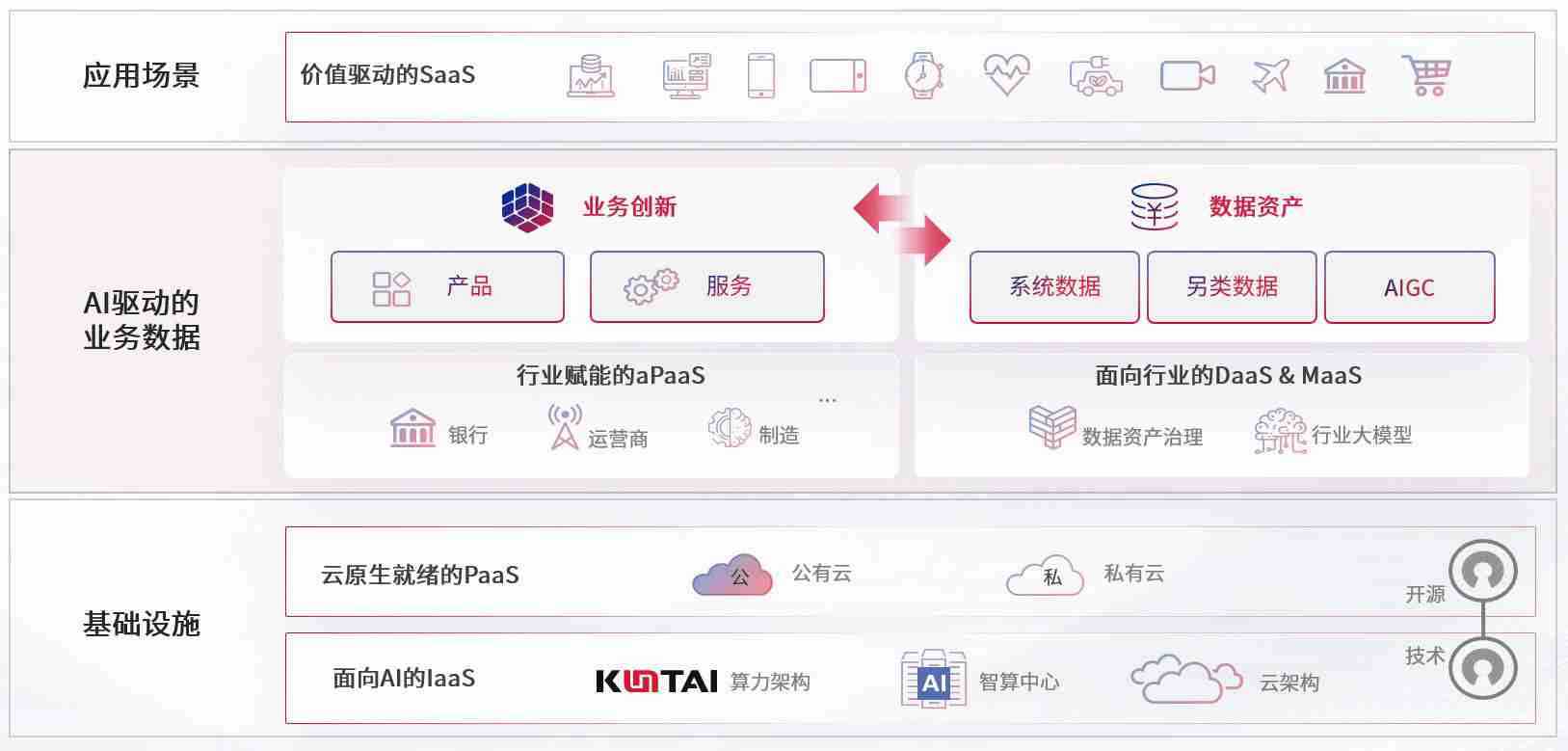 数字时代,,围绕企业数字化转型的关键要素,,尊龙z6数码开创性的提出数云融合战略和技术体系框架,,着力在云原生、、、、数字原生、、、、AI原生和信创产业上架构产品和服务能力,,为处在不同数字化转型阶段的快消零售、、汽车、、金融、、、、医疗、、、政企、、、、教育、、运营商等行业客户提供泛在的敏捷IT能力和融合的数据驱动能力,,构建跨界融合创新的数字业务场景和新业务模式,,助力企业级客户建立面向未来的核心能力和竞争优势,,,全面推动社会的数字化、、、智能化转型升级。。。。